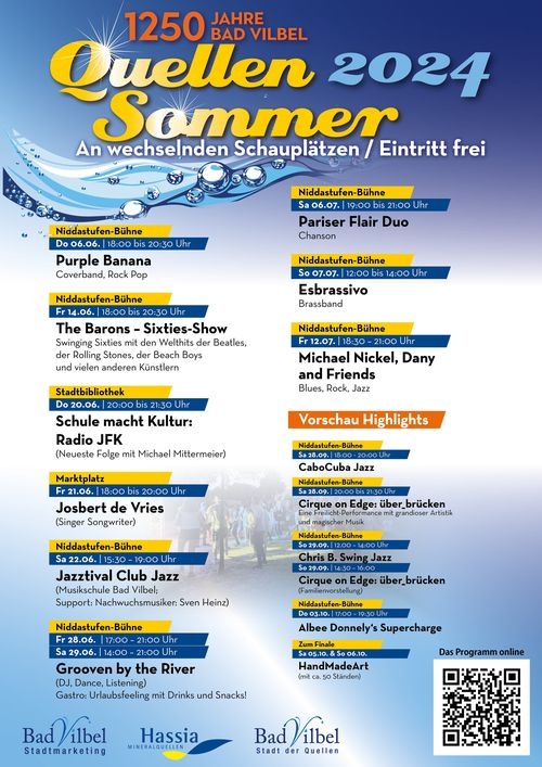 In den Sommermonaten wird Bad Vilbel zur Bühne: Der Quellensommer bringt Musik, Lesungen, Kabarett, Open-Air-Kino, Kinderprogramme und viele weitere Kulturformate an unterschiedliche Orte im Stadtgebiet – oft unter freiem Himmel und immer bei freiem Eintritt. Ob Konzert im Kurpark, Theater am Flussufer oder Mitmachangebote auf dem Niddaplatz: Der Quellensommer steht für niedrigschwellige, lebendige Kultur, mitten im Alltag und für alle Generationen.